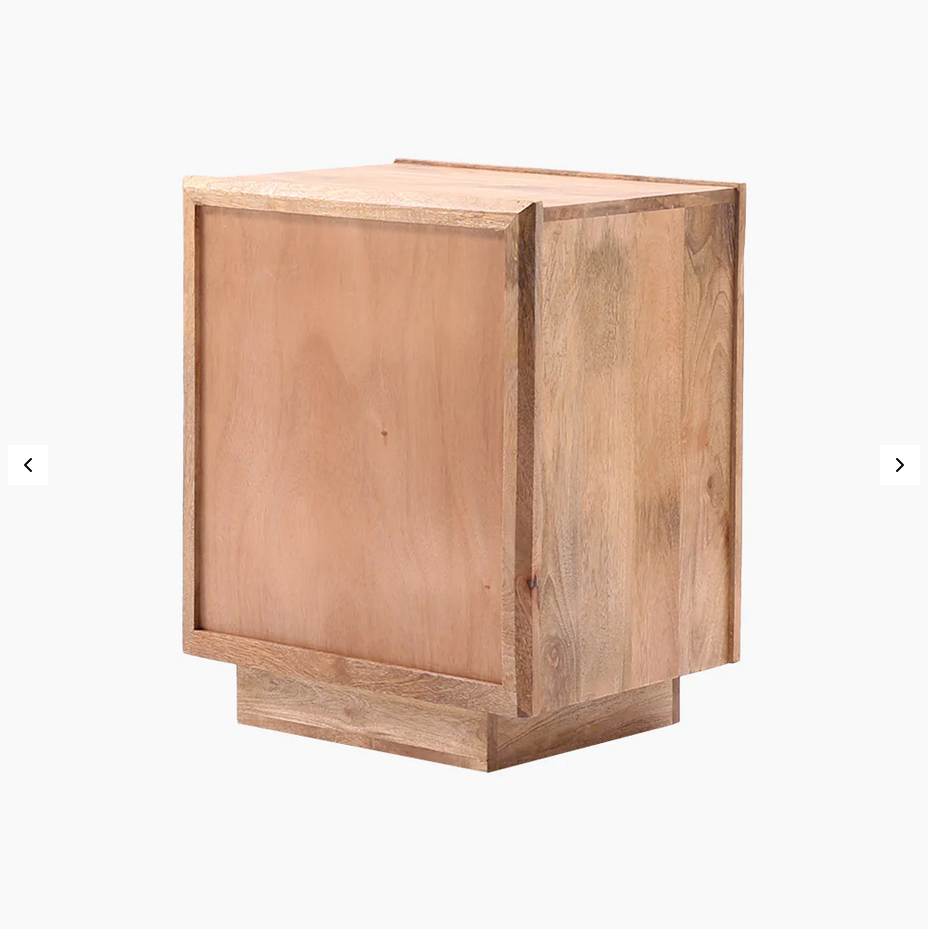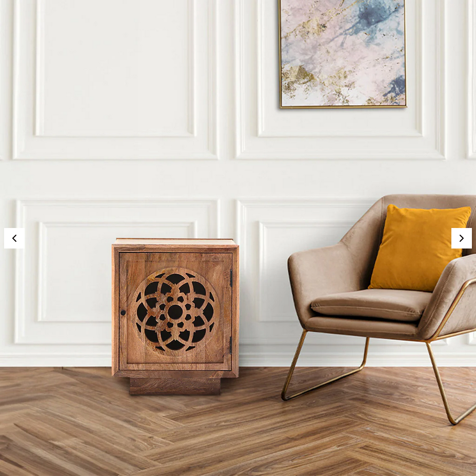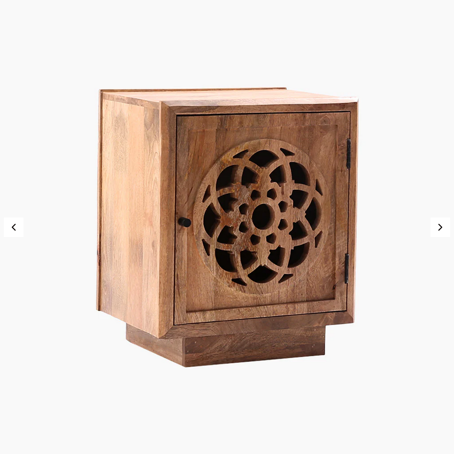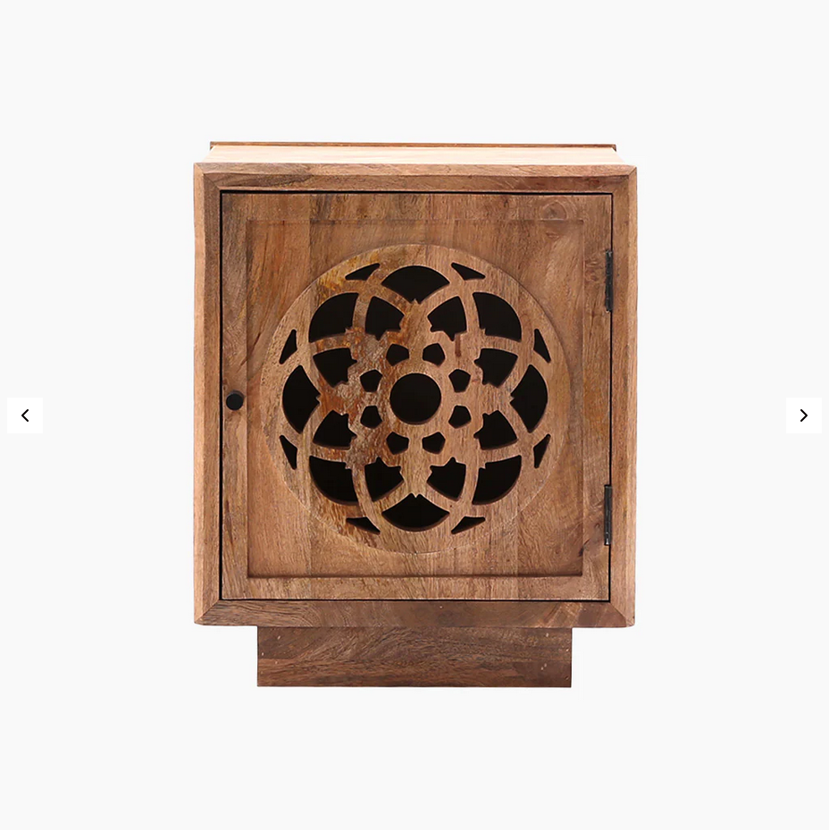 Combining impressive functionality with graceful design, the Flower of Life side table presents a silhouette crafted from mango wood with a natural finish. The front panel showcases an intricate wooden cut-out design, drawing inspiration from the sacred symbol of the Flower of Life. This versatile piece can be your bedside companion or act as an accent piece in the living room or bathroom.