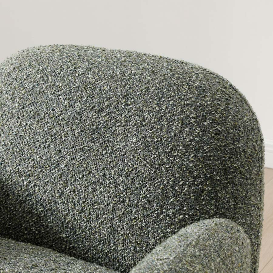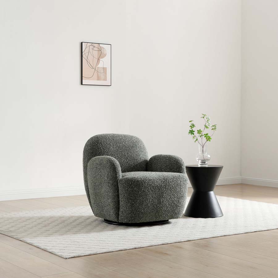 Micky is a charming swivel chair featuring curved arms and back. Available in a soft, chunky textured weave fabric in three colours in Olive, Navy or Natural.
